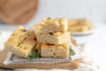 Crispy crusted, fluffy gluten-free focaccia with topped with herbs, garlic, and flaky sea salt.