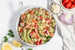 This recipe can make great meal prep, but I don’t recommend doing it too many days in advance, since some of the vegetables sweat and make the feta a little soggy after a while in the fridge.